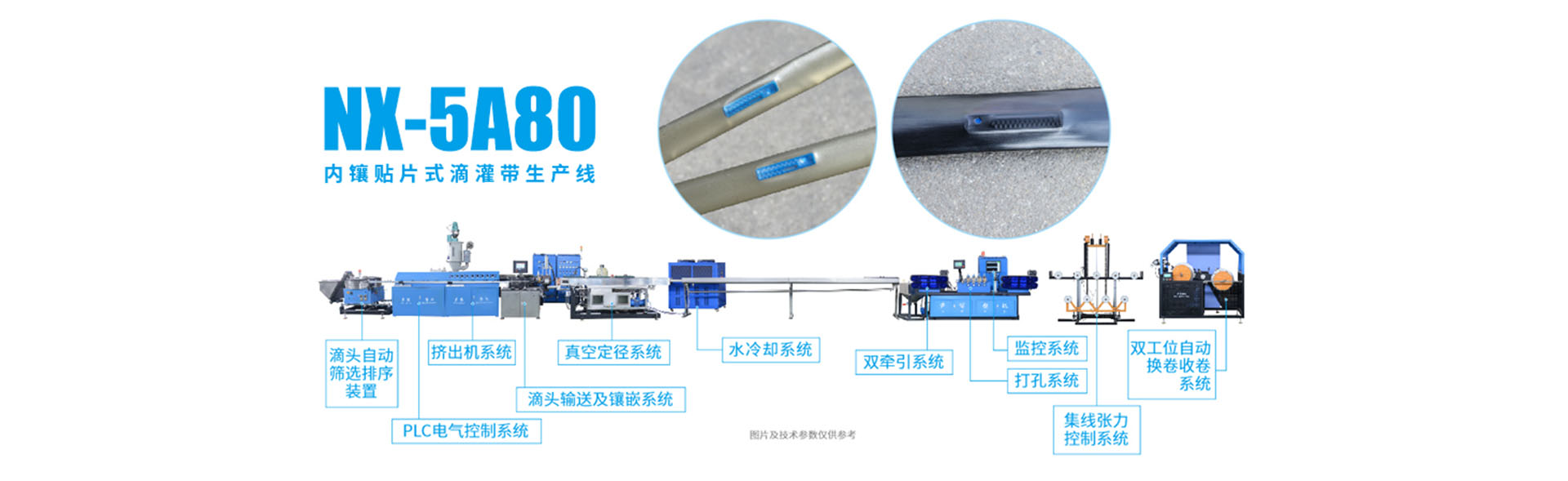 本公司注重自主研发创新和吸收国内外先进的生产技术,目前拥有多项国家zhuanli。公司主要产品包括:单翼迷宫式滴灌带生产线、内镶贴片式滴灌带生产线、水带机生产线、微喷带生产线、园林管生产线、以及配套产品:滴灌带测控仪、烘干拌料机、滴灌带包装机,正在开发的产品包括:测宽测厚仪、水带包装机、造粒机等产品。